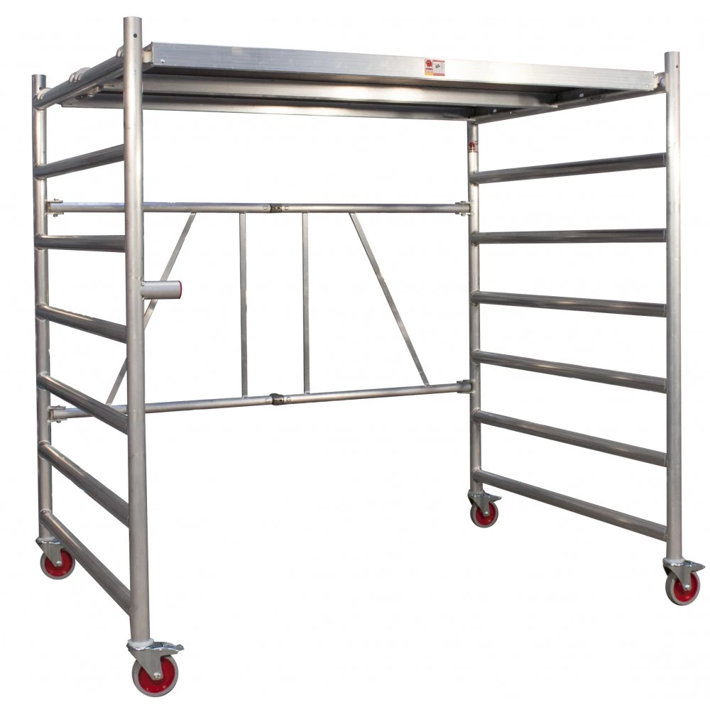 Proffessionelt foldestillads med ekstra kraftige hjul, stormlås, foldelås og ekstra stærke, fuldsvejste samlinger for bedre stabilitet og holdbarhed. Mulighed for udbygning.