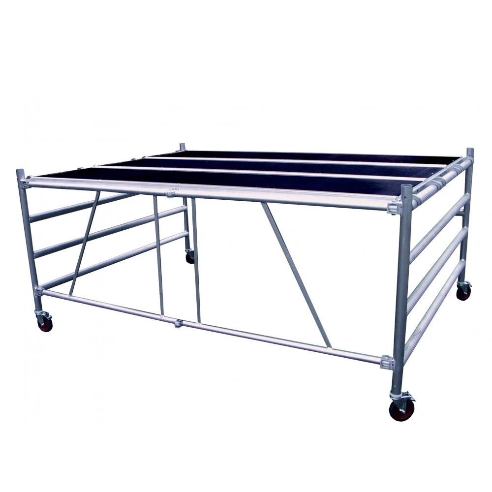 Proffessionelt foldestillads med ekstra kraftige hjul, stormlås, foldelås og ekstra stærke, fuldsvejste samlinger for bedre stabilitet og holdbarhed. Mulighed for udbygning.