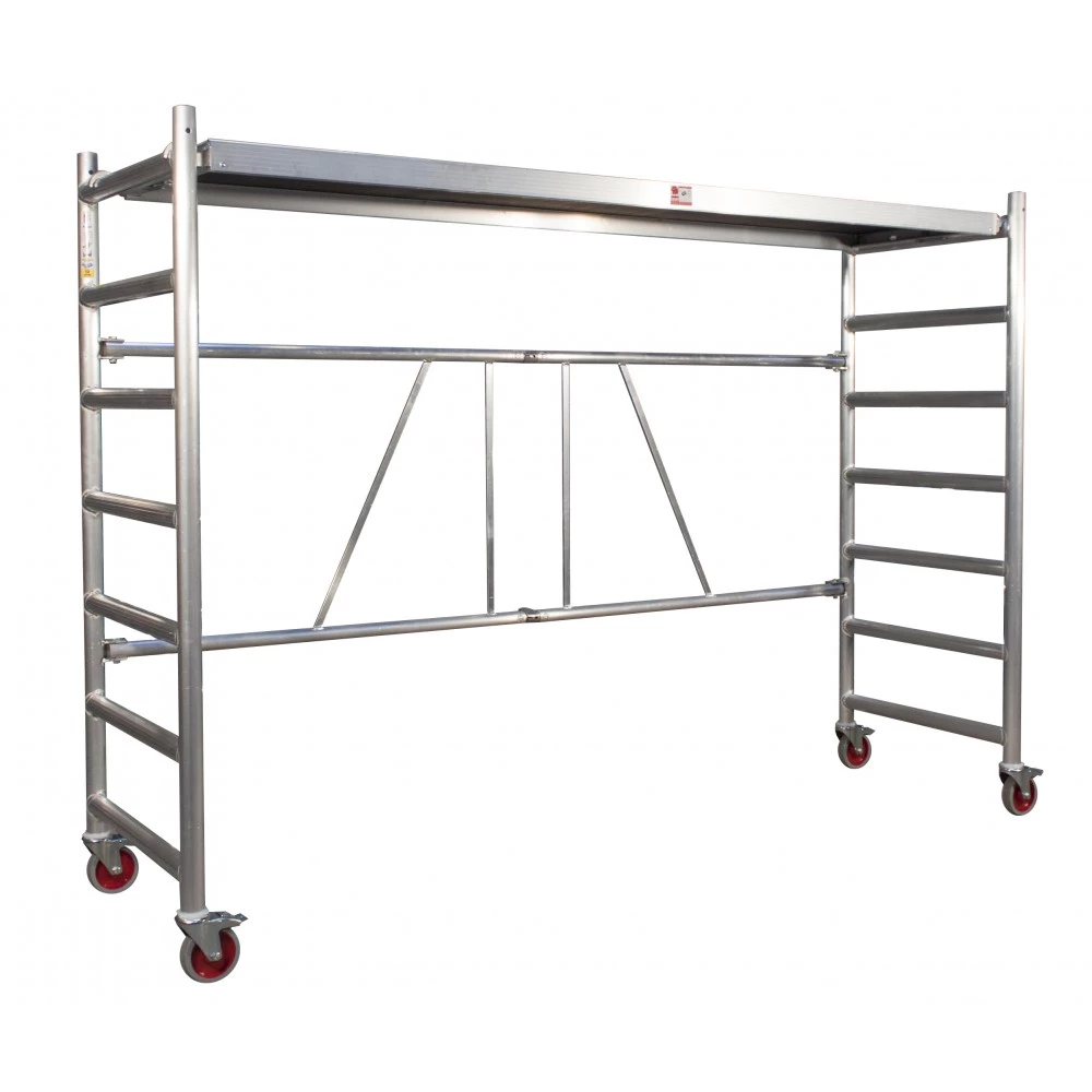 Proffessionelt foldestillads med ekstra kraftige hjul, stormlås, foldelås og ekstra stærke, fuldsvejste samlinger for bedre stabilitet og holdbarhed. Mulighed for udbygning.