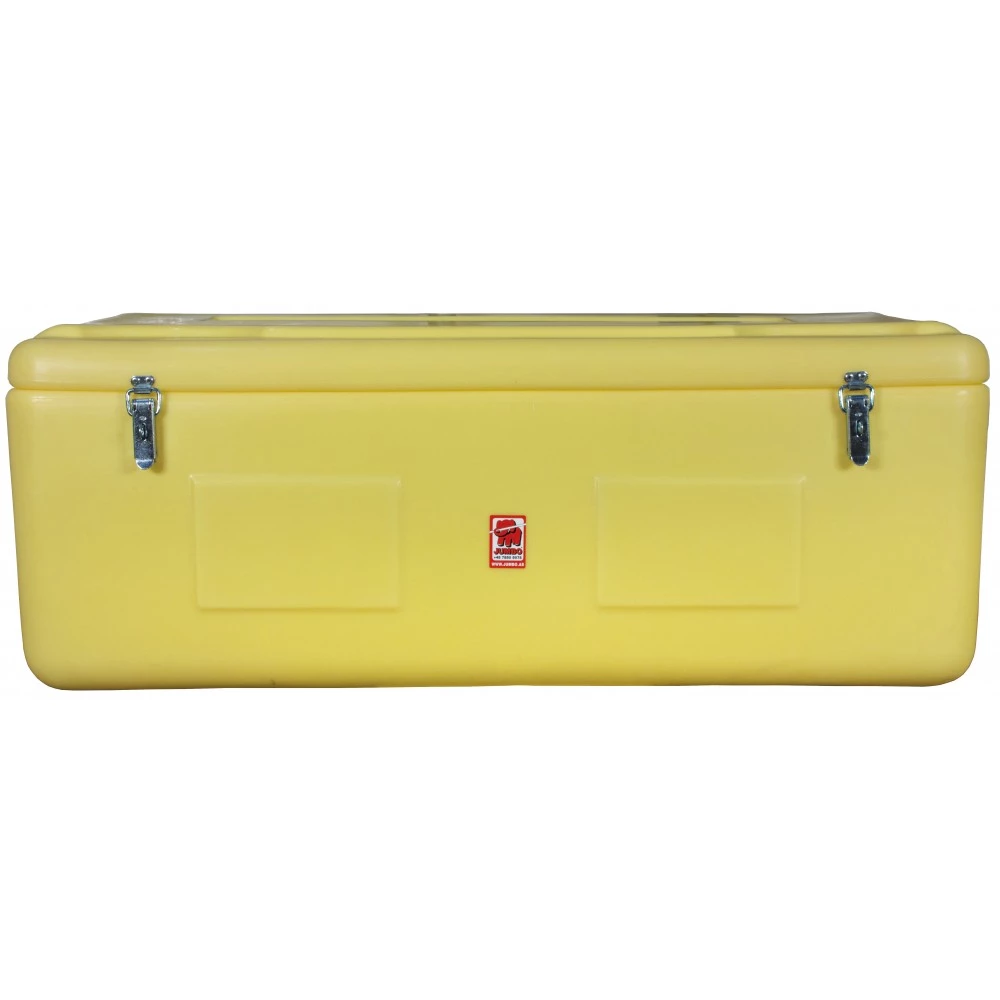 Jumbo slagfast transport- & værktøjskasse fremstillet i vejrbestandig & slagfast polyethylen. Kassen er monteret med solide bærehåndtag i rustfrit stål og låse i rustfrit stål forberedt til hængelås. Lågets udformning gør kassen støv- og stænktætte.