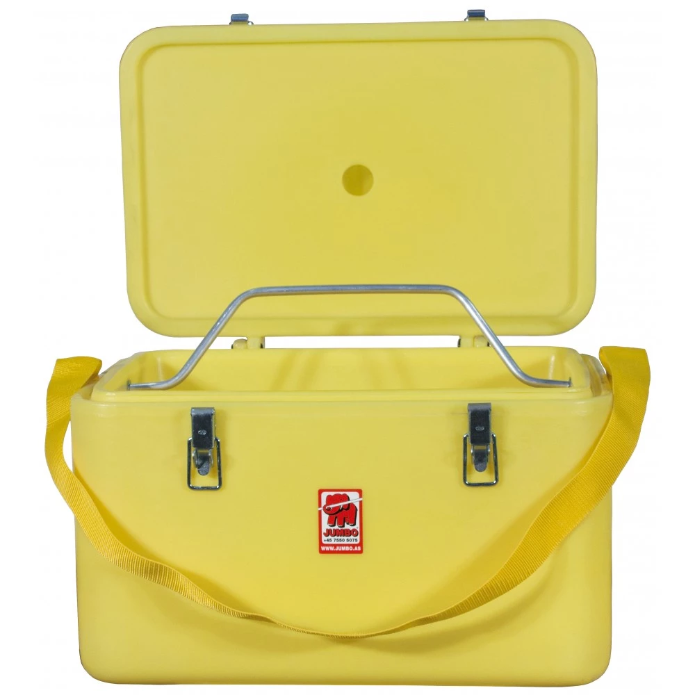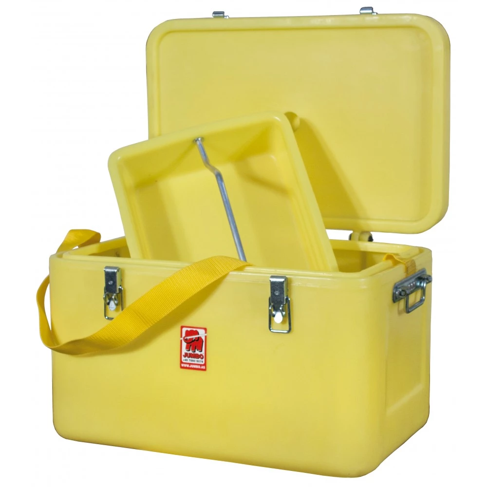 Jumbo slagfast transport- & værktøjskasse fremstillet i vejrbestandig & slagfast polyethylen. Kassen er monteret med solide bærehåndtag i rustfrit stål og låse i rustfrit stål forberedt til hængelås. Lågets udformning gør kassen støv- og stænktætte.